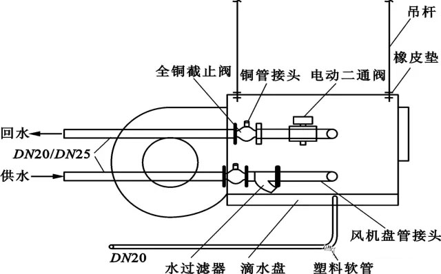 按图纸要求确定风机的规格型号及设置位置,检查安装的风机盘管表面有无破损,涡轮转动与蜗壳有无摩擦,电机有无抖动和异常噪音。