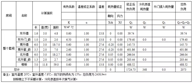 鸿博家园的采暖设计负荷依据:不包括公摊的采暖建筑面积为59m2,室内设计温度20℃,室外设计温度-7.8℃,外墙传热系数0.6w/m2·℃,外窗2.6w/m2·℃,采暖设计负荷为2073W,其中冷风渗透负荷为348W,占16.8%左右,单位面积负荷34.55W/m2,考虑了相邻不采暖的因素,地板向下热损失取15%,则采暖设计供热量为2438.9W。