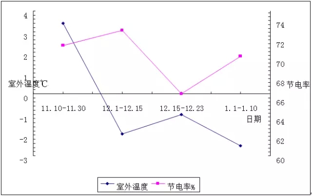 表3是补充地面上的热流计以后的测试数据,该表中的热流一项数据反映了地板向上的供热量(W/m2)。室温21~22℃时的情况,数据均验证了该测试房的负荷计算的准确性。下图为曲线表现了不同月份及外温下的节能率。